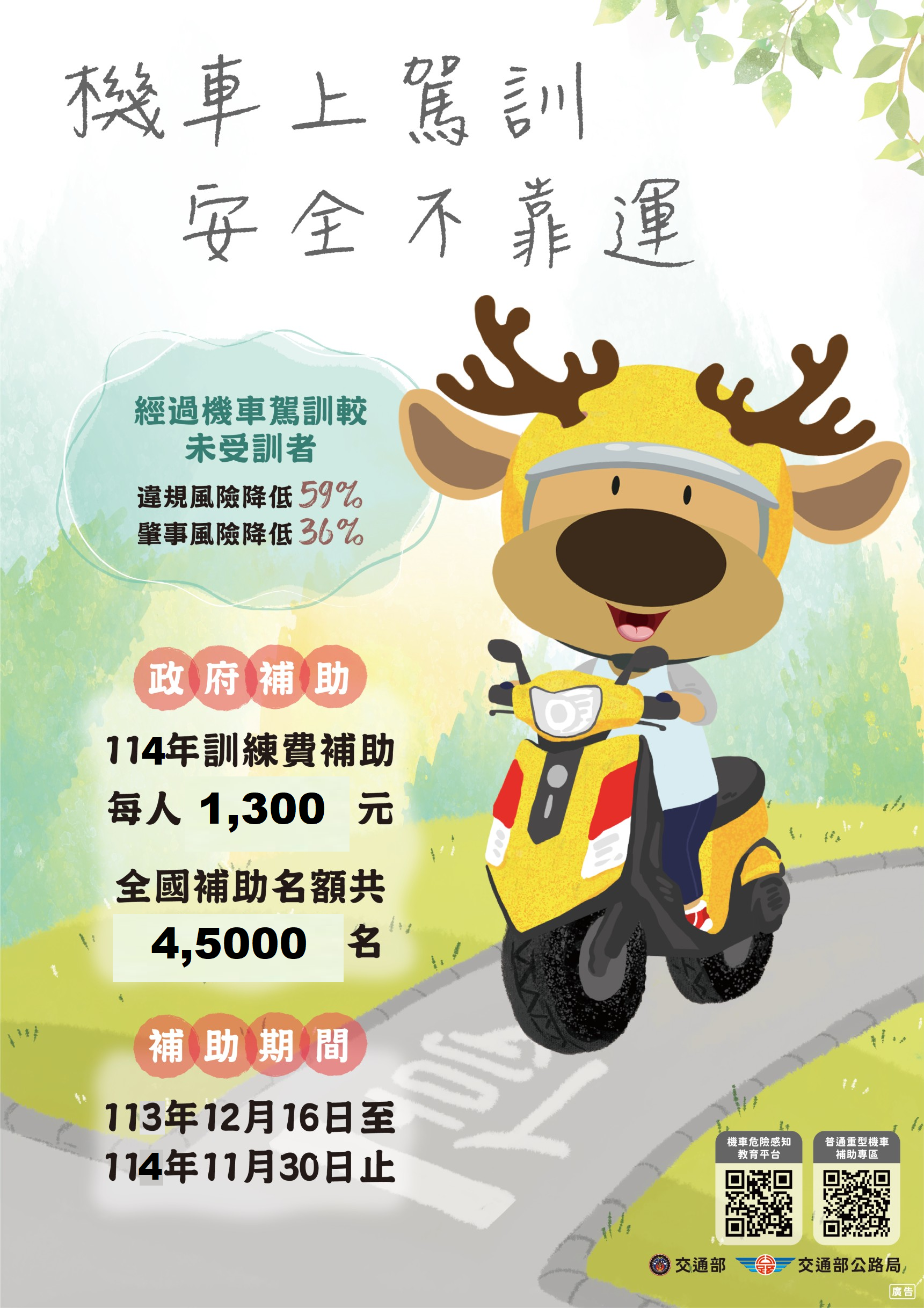 二、為鼓勵民眾參加機車駕訓,養成正確駕駛習慣,交通部公路局持續推動機車駕訓制度計畫補助,凡民眾經完整「機車駕訓」課程並合格取得駕照者,提供每人新臺幣(下同)1,300元補助,另臺中市政府加碼補助每人1,500元,共3,000名額;彰化縣政府及南投縣政府加碼補助每人1,000元,各約1,000名額,名額有限,額滿為止。