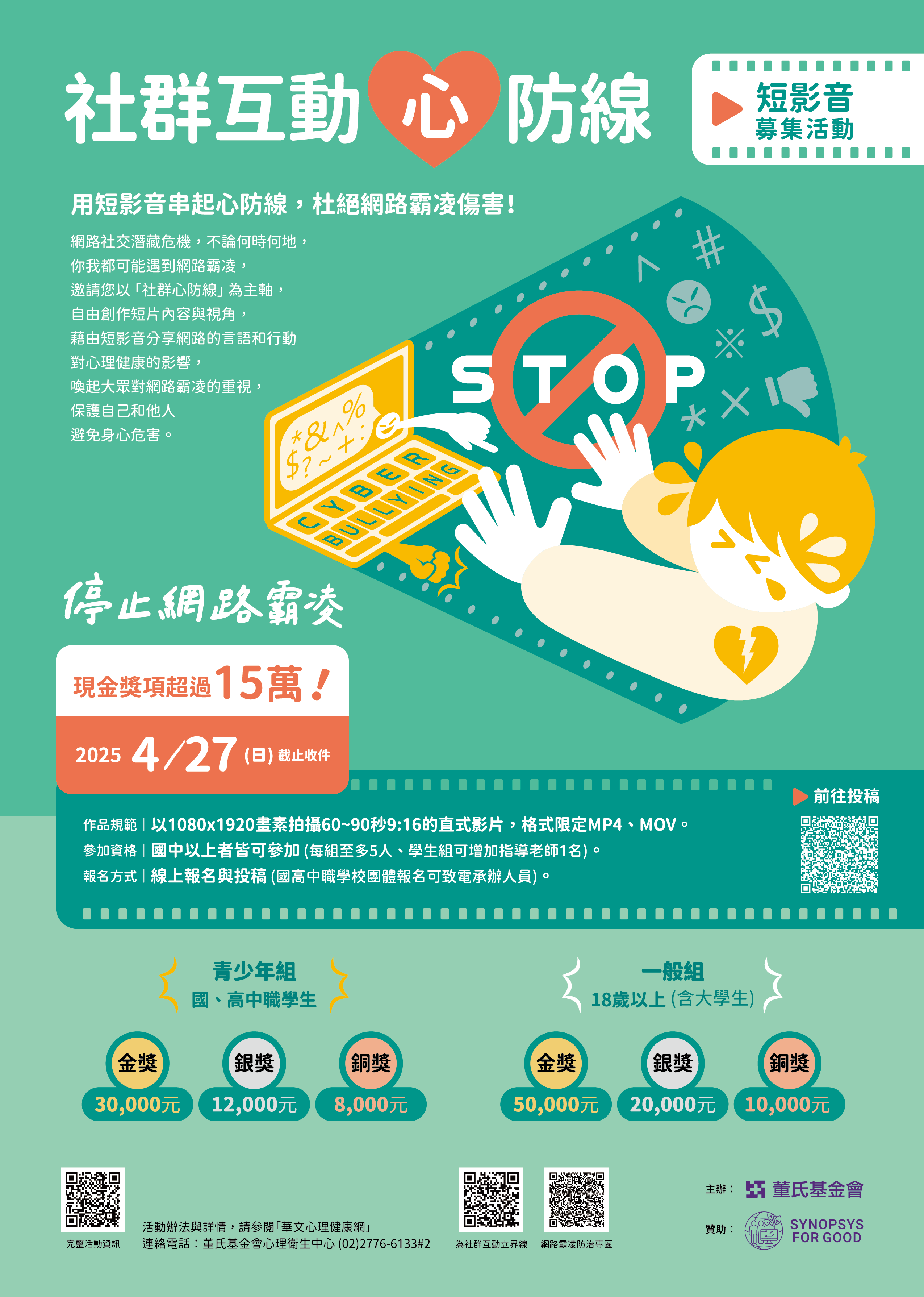 一、為鼓勵青少年透過活動參與了解預防網路霸凌傷害的重要性,董氏基金會今年舉辦「社群互動”心”防線」停止網路霸凌短影音募集活動,即日起開始收件至民國114年4月27日止,邀請學生與民眾拍攝60-90秒直式短影音投稿,得獎作品可獲得獎金,青少年組首獎現金三萬元、一般組現金五萬元。
